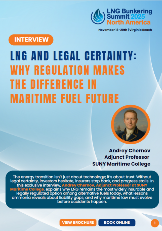 The energy transition isn’t just about technology; it’s about trust. Without legal certainty, investors hesitate, insurers step back, and progress stalls. In this exclusive interview, Andrey Chernov, Adjunct Professor at SUNY Maritime College, explains why LNG remains the only insurable and regulated option today, what lessons ammonia reveals about liability gaps, and why maritime law must evolve before accidents happen.